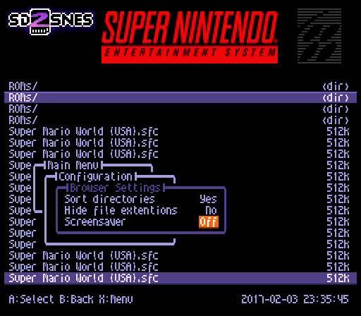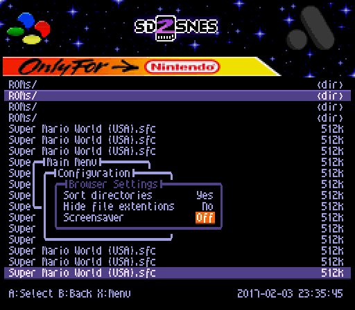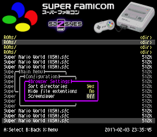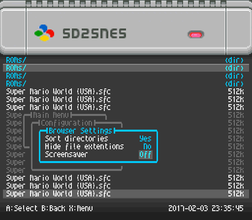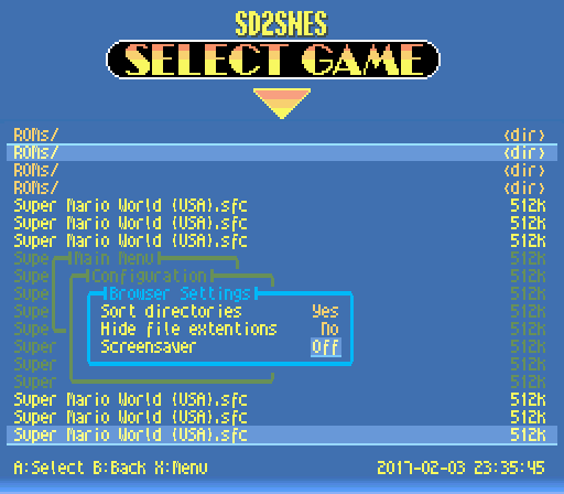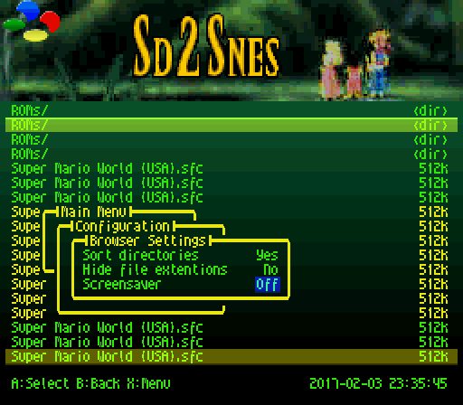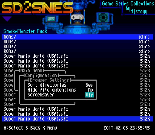 É possível personalizar o menu do SD2SNES com temas, cores e imagens.